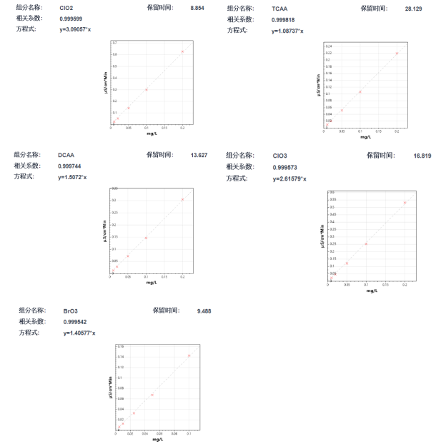 準(zhǔn)確的檢測結(jié)果,需要嚴(yán)謹(jǐn)?shù)臉?biāo)準(zhǔn)曲線制作與重復(fù)性驗(yàn)證作為支撐。本次檢測先配制五種消毒副產(chǎn)物的標(biāo)準(zhǔn)物質(zhì)溶液,其中亞氯酸鹽、溴酸鹽、氯酸鹽標(biāo)準(zhǔn)溶液濃度為 1000mg/L,二lv乙酸、三lv乙酸標(biāo)準(zhǔn)溶液濃度為 100mg/L,再通過精準(zhǔn)移取與稀釋,制備出混合標(biāo)準(zhǔn)使用液,隨后經(jīng)自動進(jìn)樣器稀釋成不同濃度的標(biāo)準(zhǔn)系列。